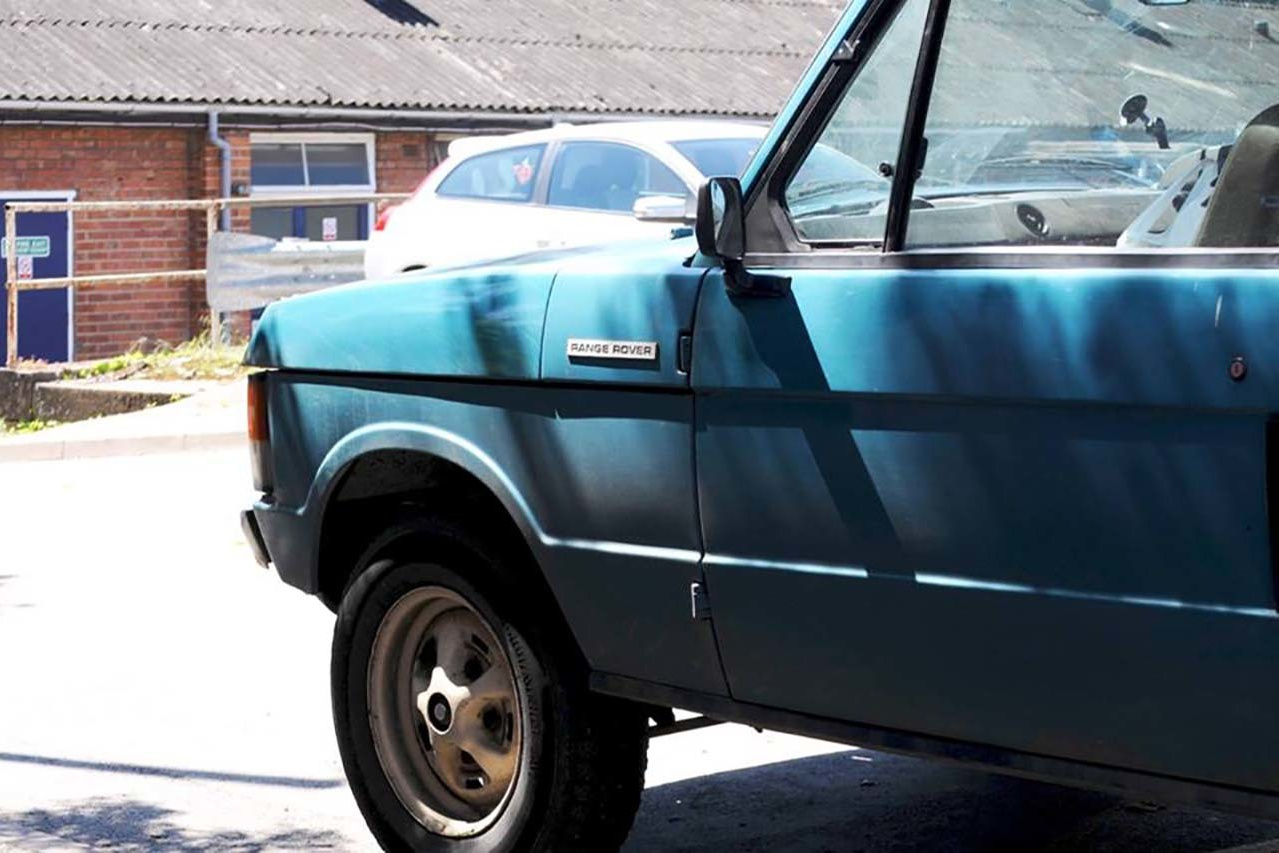 ふと振り返ると、僕の真後ろに、写真のように2ドアのクラシックレンジローバーが駐車していたのです。1970年代モデルのこの色名はTUSCAN BLUE(トスカーナブルー)。イタリアのワインの美味いトスカーナ地方の青空なのか、トスカーナの海の色なのか、ナチュラルで透明なブルーです。どんよりとした曇りの日が多いイギリスには、より映える青に思えました。
