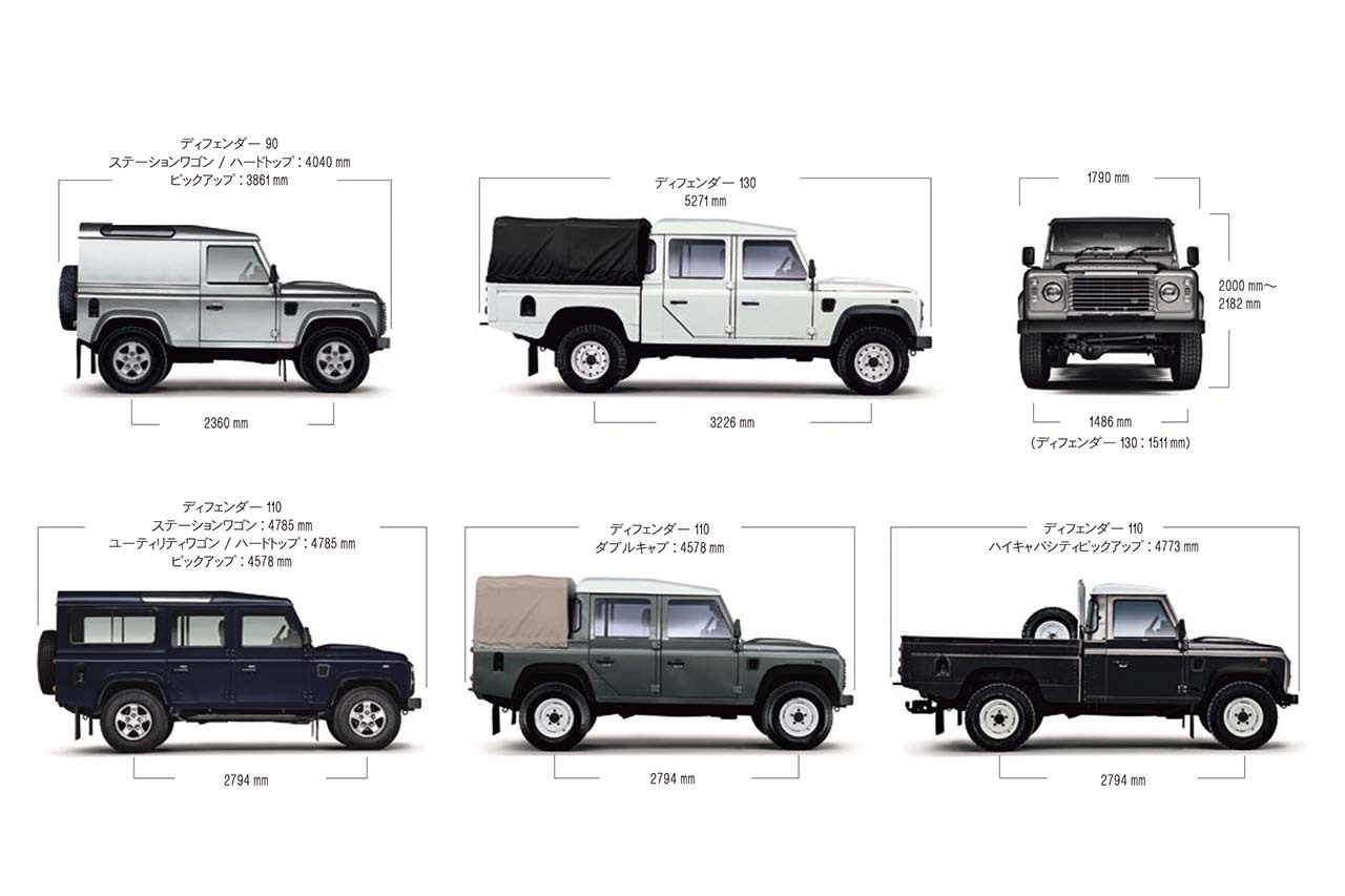ディフェンダーの名前の後には「90(ナインティ)」「110(ワンテン)」「130(ワンサーティ)」という数字が付きます。これはホイールベースの長さを表していて、「90」が一番短くホイールベースが90インチ=2360mmです。「110」が2794mm、「130」が3226mmとなります。