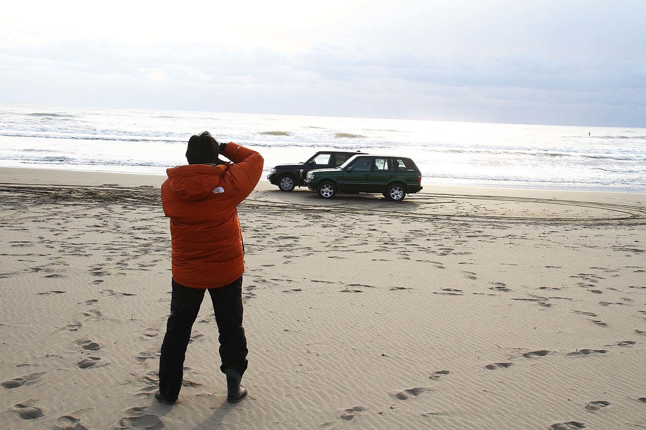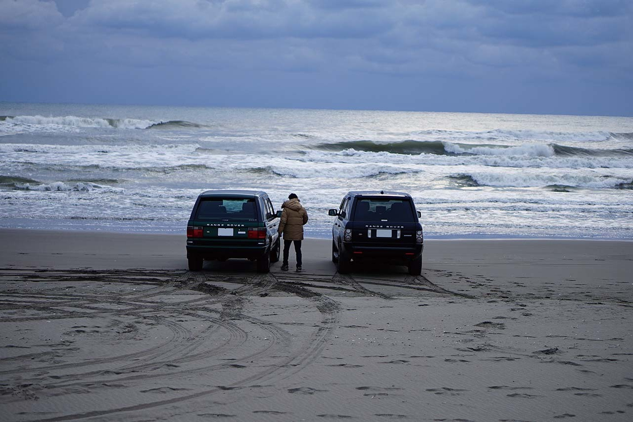 同じ道を戻ったりと右往左往しながら、やっと海に入れる場所が見つかった。波打ち際にレンジローバーを置く。水平線あたりの曇り空から、うっすらと朝陽が見える。逆光だったが、それがまた海を、そしてレンジローバーを輝かせる。どこに置いても、どのように撮っても画になる。これが自分の愛車だからこそ、なお嬉しい。一台だけで撮っても、二台並べても、まるで広告のような写真となる。こういう時、「格好良い」という言葉しか出ない。もし、ここでいろいろな形容詞で説明できるのであれば、それは言葉遊びだ。もっと言えば、言葉はいらない。この景色をずっと見ているだけでいい。