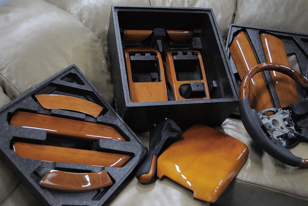 いろいろとシミュレーションして、30thアニバーサリーエディションのような上品かつ優雅さを感じられるインテリアに変えてみました。純正のチェリーウッドパネルにクリアを施し、ステアリングはリメイクしたウッドコンビにしました。