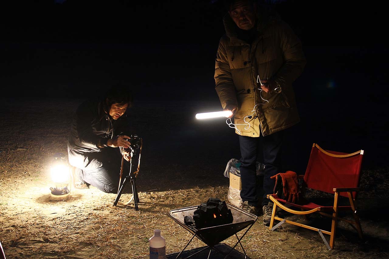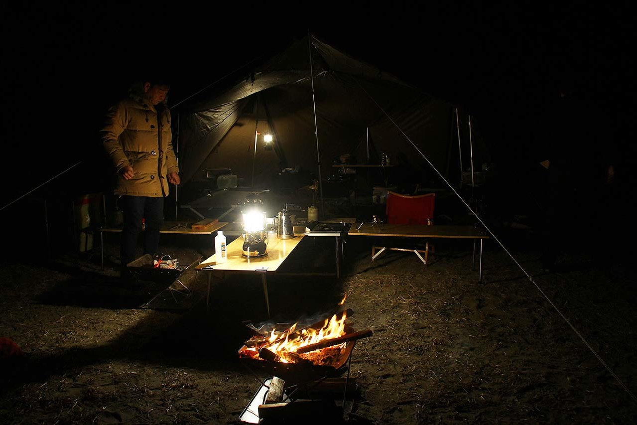 場所は九十九里のキャンプ場。2月7日の九十九里の気温は1度から7度。昼はざらついた海風に煽られ、夜は当然のごとく地面は凍てつき、吐く息は白く鼻は赤くなり、手はかじかみ、身をかばうような真冬である。