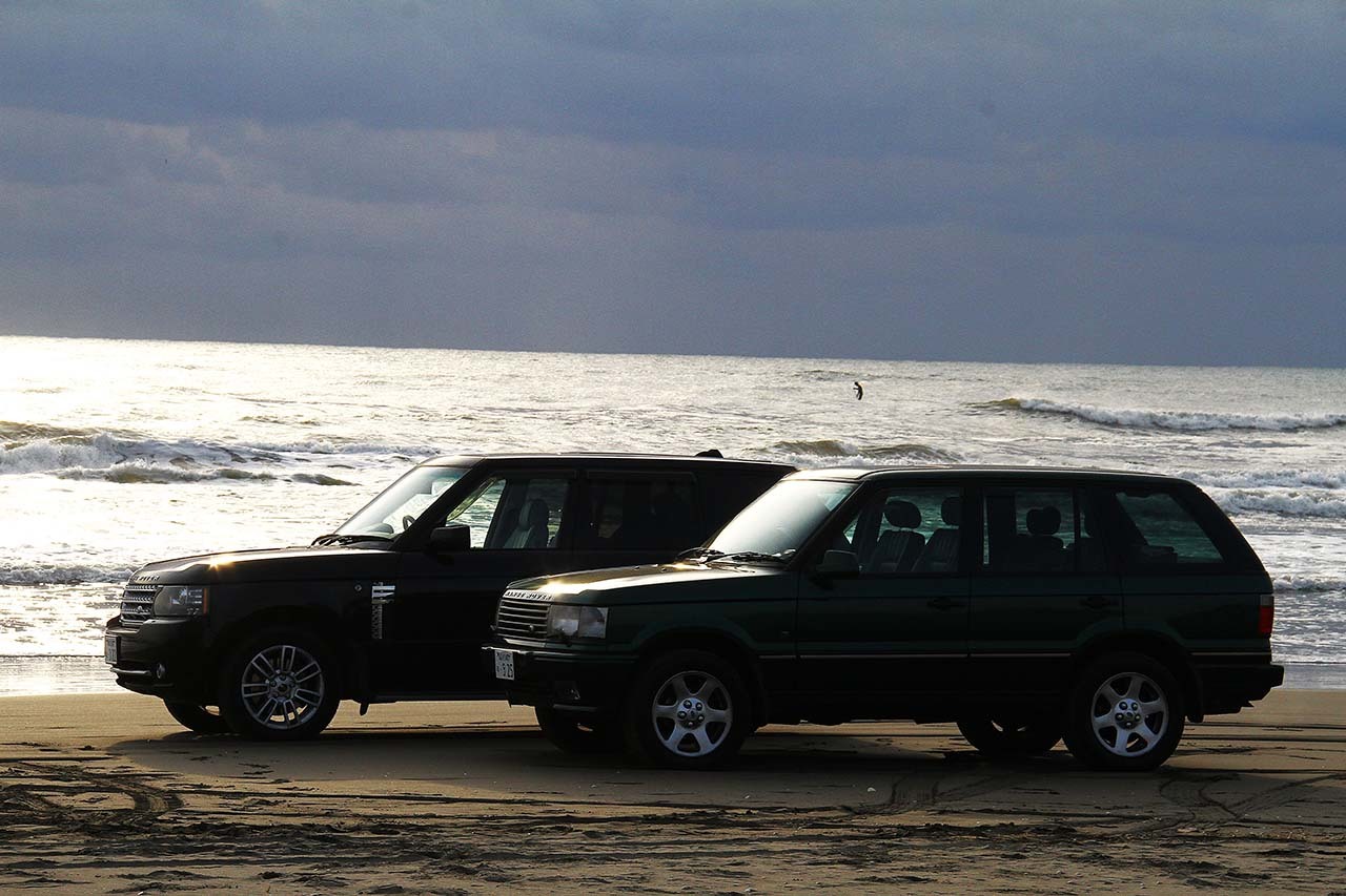 同じ道を戻ったりと右往左往しながら、やっと海に入れる場所が見つかった。波打ち際にレンジローバーを置く。水平線あたりの曇り空から、うっすらと朝陽が見える。逆光だったが、それがまた海を、そしてレンジローバーを輝かせる。どこに置いても、どのように撮っても画になる。これが自分の愛車だからこそ、なお嬉しい。一台だけで撮っても、二台並べても、まるで広告のような写真となる。こういう時、「格好良い」という言葉しか出ない。もし、ここでいろいろな形容詞で説明できるのであれば、それは言葉遊びだ。もっと言えば、言葉はいらない。この景色をずっと見ているだけでいい。
